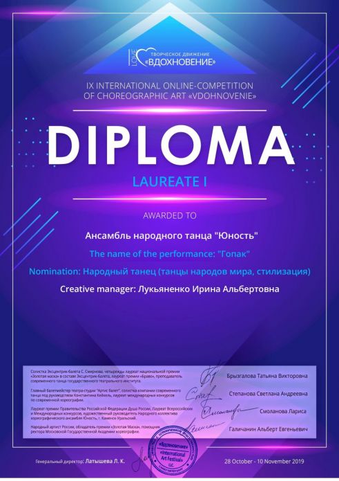 Журі, до якого увійшли відомі діячі мистецтв, присудило “ЮНОСТІ” Диплом лауреата І ступеня у номінації «Танці народів світу. Стилізація». Оцінювалися школа, композиція, лексика, артистизм.