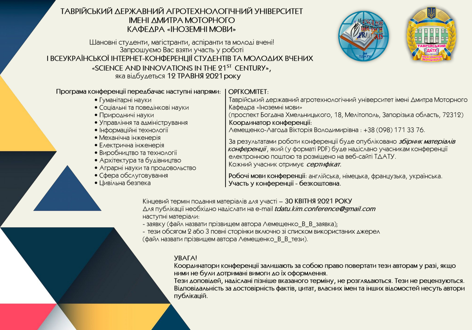 Кафедра «Іноземні мови» ТДАТУ запрошує студентів, магістрантів, аспірантів та молодих вчених взяти участь у І Всеукраїнській Інтернет-конференції студентів та молодих вчених «Science and innovations in the 21st century»