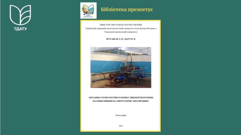 До репозитарію надійшла монографія «Механіко-технологічні основи глибокої переробки насіння рицини на енергетичну біосировину», авторами якої є вчені ТДАТУ і Уманського національного університету (УНУ) – д.т.н., професор Дмитро Журавель і д.т.н. професор Володимир Дідур.