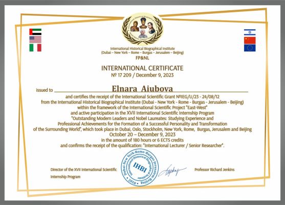 Протягом жовтня – грудня 2023 року старший викладач кафедри ГЕЗ, к.б.н. Ельнара Аюбова взяла участь у XVII Міжнародній програмі наукового стажування в об’ємі 180 годин (6 кредитів ECTS) «Outstanding Modern Leaders and Nobel Laureates: Studying Experience and Professional Achievements for the Formation of a Successful Personality and Transformation of the Surrounding World, which took place in Dubai, Oslo, Stockholm, New York, Rome, Burgas, Jerusalem and Beijing October 20- December 9, 2023». Програма від організаторів міжнародного стажування International Historical Biographical Institute (Dubai – New York – Rome – Burgas – Jerusalem – Beijing) входить до Міжнародних Програм FP&NL, які дають змогу увійти до європейського освітнього простору.