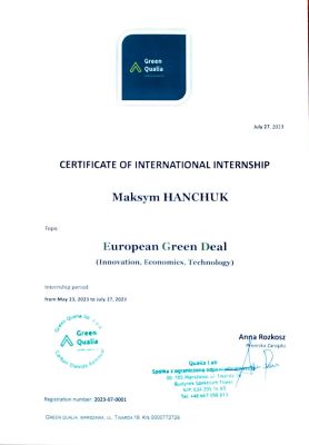 З травня по червень 2023 року доцент кафедри ГЕЗ к.с.-г.н. Максим Ганчукпроходив міжнародне науково-педагогічне стажування «European Green Deal: Innovation, Engineering, Food Safety». Програма міжнародного стажування від польського Сільськогосподарського університету імені Гуго Коллонтая передбачала цикл семінарів європейських науковців.