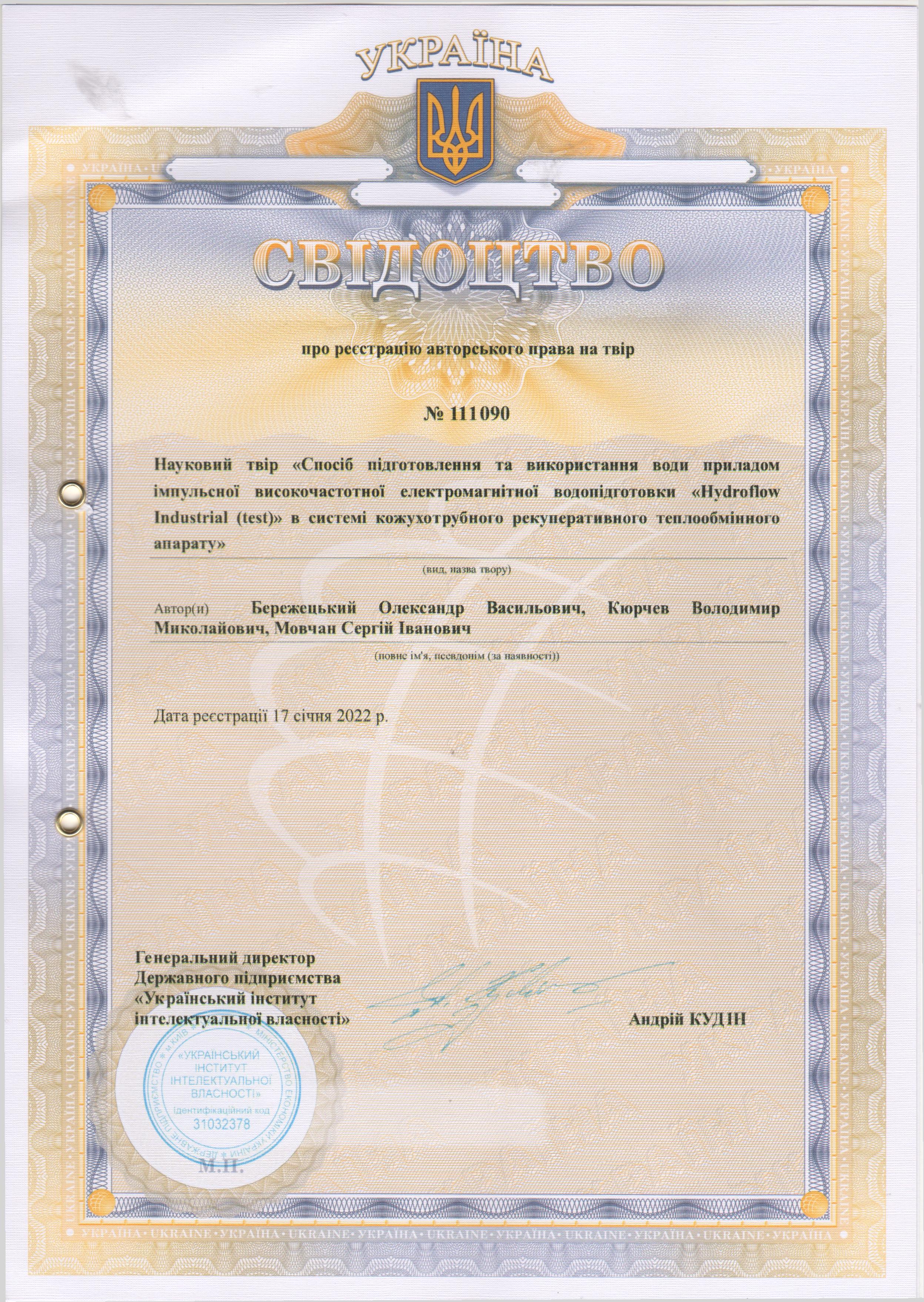 Науковці ТДАТУ отримали авторське свідоцтво на твір щодо підготовки та використання води приладом «Hydroflow Industrial (test)»