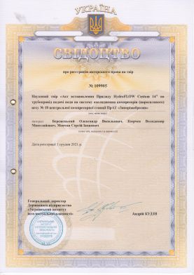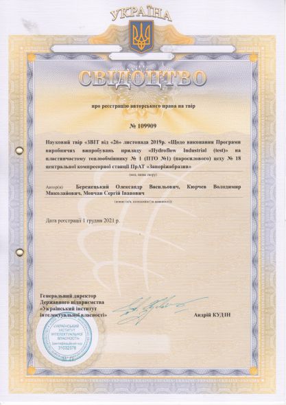 4. Свідоцтво про реєстрацію авторського права на твір №109909. Дата реєстрації 08 листопада 2021 р. №с202108268. Літературний письмовий твір наукового характеру «ЗВІТ від «26» листопада 2019р. «Щодо виконання Програми виробничих випробувань приладу «Hydroflow Industrial (test)» на пластинчастому теплообміннику № 1 (ПТО №1) (паросилового) цеху №18 центральної компресорної станції ПрАТ «Запоріжабразив» / О.В.Бережецький, В.М. Кюрчев, С.І. Мовчан // ПрАТ «Запоріжабразив»: Запоріжжя, 2021. – 18 с.
