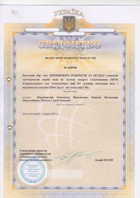 3. Свідоцтво про реєстрацію авторського права на твір №109908. Дата реєстрації 08 листопада 2021 р. №с202108072. Літературний письмовий твір наукового характеру «АКТ ПРОМІЖНОГО РОЗКРИТТЯ ТА ОГЛЯДУ елементів трубопроводів подачі води на систему мокрого газоочищення (МГО) відпрацьованого газу технологічної лінії №1 дільниці обпалення цеху з виробництва окатків (ЦВО) ПрАТ «Полтавський ГЗК» / О.В.Бережецький, В.М. Кюрчев, С.І. Мовчан // ПрАТ «Полтавський ГЗК»: Горішні Плавні, 2021. – 10 с.