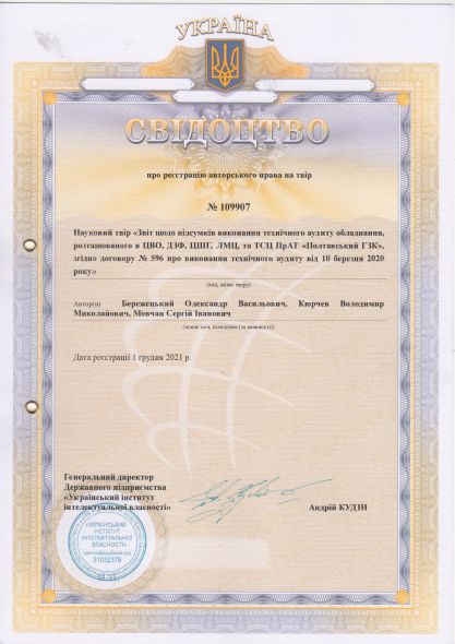 2. Свідоцтво про реєстрацію авторського права на твір №109907. Дата реєстрації 08 листопада 2021 р. №с202108042. Літературний письмовий твір наукового характеру «Звіт щодо підсумків виконання технічного аудиту обладнання, розташованого в ЦВО, ДЗФ, ЦШГ, ЛМЦ, та ТСЦ ПрАТ «Полтавський ГЗК» згідно договору № 596 про виконання технічного аудиту від 10 березня 2020 року / О.В.Бережецький, В.М. Кюрчев, С.І.Мовчан // ПрАТ «Полтавський ГЗК»: Горішні Плавні, 2021. – 16 с.