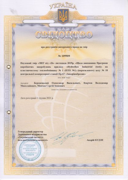 4. Свідоцтво про реєстрацію авторського права на твір №109909. Дата реєстрації 08 листопада 2021 р. №с202108268. Літературний письмовий твір наукового характеру «ЗВІТ від «26» листопада 2019р. «Щодо виконання Програми виробничих випробувань приладу «Hydroflow Industrial (test)» на пластинчастому теплообміннику № 1 (ПТО №1) (паросилового) цеху №18 центральної компресорної станції ПрАТ «Запоріжабразив» / О.В.Бережецький, В.М. Кюрчев, С.І. Мовчан // ПрАТ «Запоріжабразив»: Запоріжжя, 2021. – 18 с.
