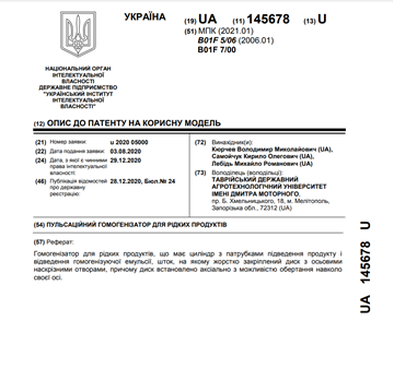 Наприкінці минулого року на сайті ДП «Український інститут інтелектуальної власності» (УКРПАТЕНТ) був опублікований патент на корисну модель № 145678 “Пульсаційний гомогенізатор для рідких продуктів”, авторами якого є: ректор університету, член-кореспондент НААН України, д.т.н., проф. Володимир Кюрчев, завідувач кафедри ОПХВ імені професора Ф.Ю. Ялпачика, д.т.н., проф. Кирило Самойчук, аспірант Михайло Лебідь.