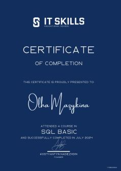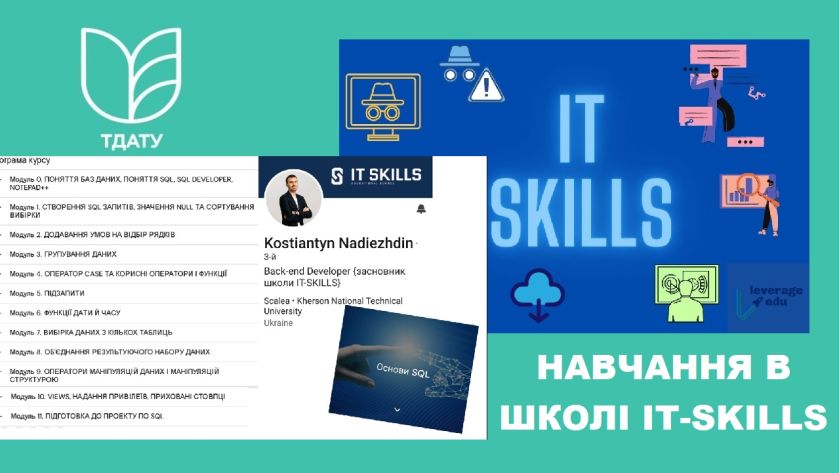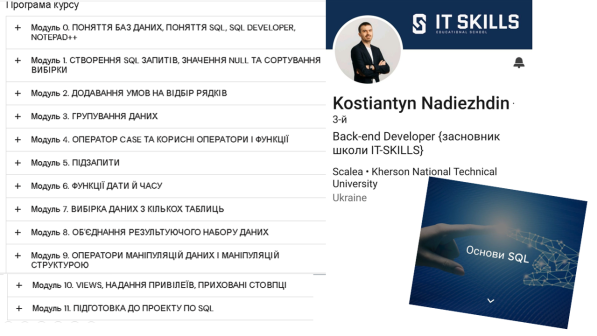Цього навчального року доцент кафедри ГЕЗ Ольга Мазикіна обрала курс Основи SQL, розроблений Костянтином Надєждіним. Костянтин є засновником школи IT-SKILLS, багато років працював і продовжує працювати у сфері IT, має більше десяти років досвіду роботи в різних ІТ_компаніях, викладає курси, що пов’язані з програмуванням, мовою структурованих запитів, використанням бази даних.