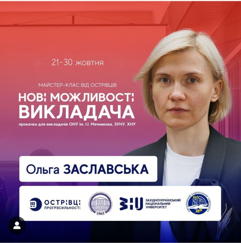 З 21 по 30 жовтня з метою поглиблення знань та навичок у викладацькій діяльності, обміну досвідом з колегами, отримання практичних порад та інструментів для успішного навчання та викладання, Острівці Прогресильності Одеського національного університету імені І. І. Мечникова, Західноукраїнського та Хмельницького національних університетів, в межах ініціативи «Як полегшити життя освітянина?» провели онлайн-курси підвищення кваліфікації «Нові можливості для викладача: майстер-клас від Острівців Прогресильності ОНУ імені І. І. Мечникова, ЗУНУ та ХНУ».