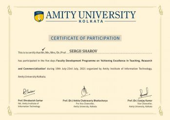 Викладачі кафедри комп’ютерних наук ТДАТУ: Сергій Шаров, Дмитро Лубко та Оксана Строкань взяли участь у міжнародному стажуванні «Achieving Excellence in Teaching, Research and Commercialization». Захід було організовано в онлайн режимі за допомогою Microsoft Teams. Організаторами програми розвитку були Amity Institute of Information Technology, Amity University (Калькутта, Індія). Взяти участь у стажування могли кандидати наук, викладачі закладів вищої освіти, науковці.