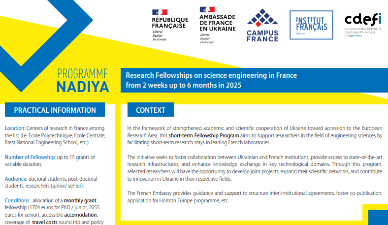 Посольство Франції в Україні у партнерстві з Конференцією директорів французьких інженерних шкіл (CDEFI) та її мережею оголошує конкурс на отримання стипендій з наукової мобільності високого рівня (SSHN) для українських дослідників в галузі інженерних наук в рамках програми NADIYA.