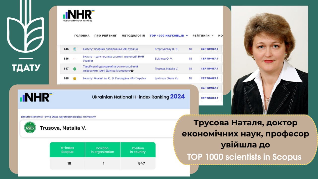 Науковиця ТДАТУ увійшла до ТОП 1000 найкращих вчених України за оцінкою показника індексу Гірша в Scopus
