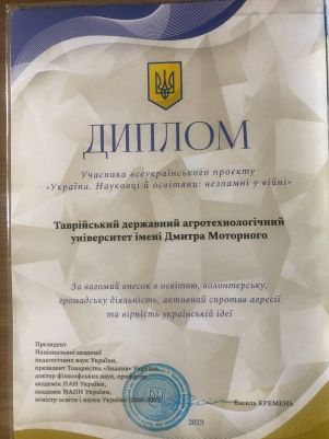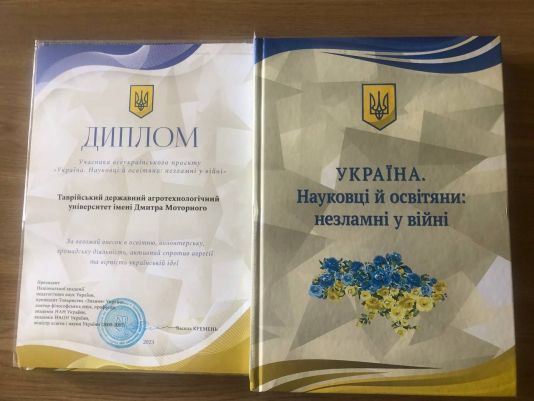 Також колектив ТДАТУ нагороджено дипломом учасника всеукраїнського проєкту: “Україна. Науковці й освітяни: незламні у війні”.