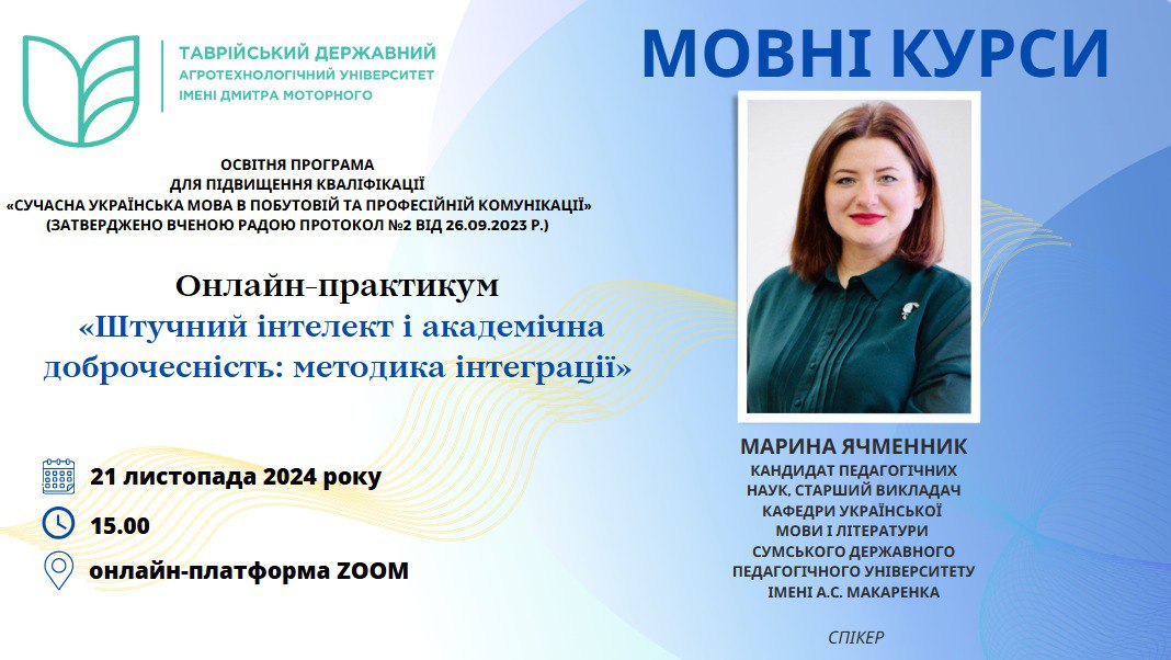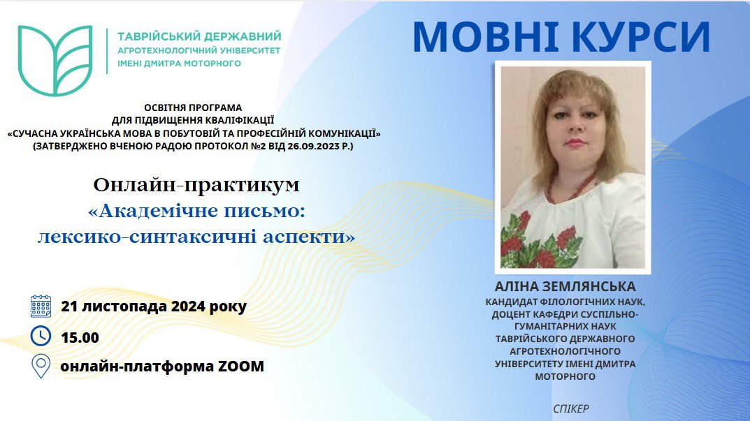 Запрошуємо науково-педагогічних, педагогічних працівників, аспірантів Таврійського державного агротехнологічного університету імені Дмитра Моторного та всіх охочих на мовний курс за освітньою програмою підвищення кваліфікації «Сучасна українська мова в побутовій та професійній комунікації», онлайн-практикум за модулем