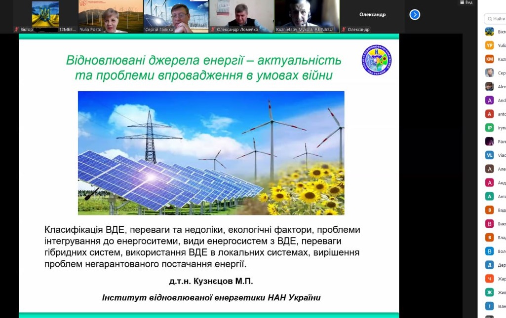 В гості був запрошений доктор технічних наук, заступник директора з наукової роботи Інституту відновлювальної енергетики НАН України, завідувач відділу комплексних енергетичних систем, старший науковий співробітник МИКОЛА ПЕТРОВИЧ КУЗНЄЦОВ. Лекція була на тему «Відновлювальні джерела енергії – актуальність та проблеми впровадження в умовах війни».