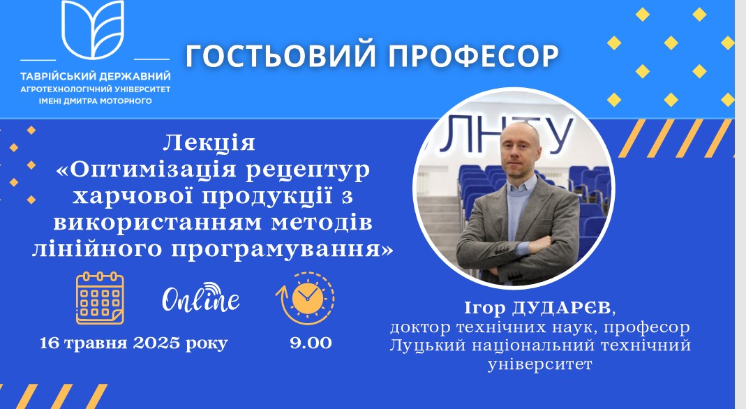 «ОПТИМІЗАЦІЯ РЕЦЕПТУР ХАРЧОВОЇ ПРОДУКЦІЇ З ВИКОРИСТАННЯМ МЕТОДІВ ЛІНІЙНОГО ПРОГРАМУВАННЯ», яка відбудеться 16 травня 2025 р. о 9.00