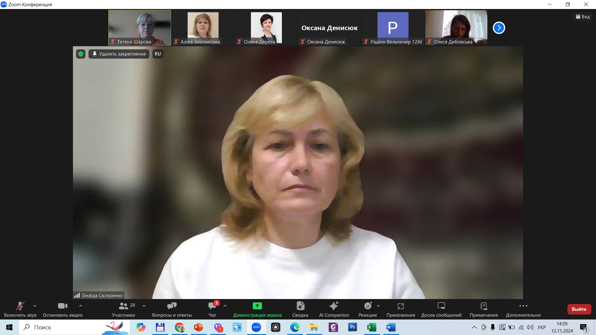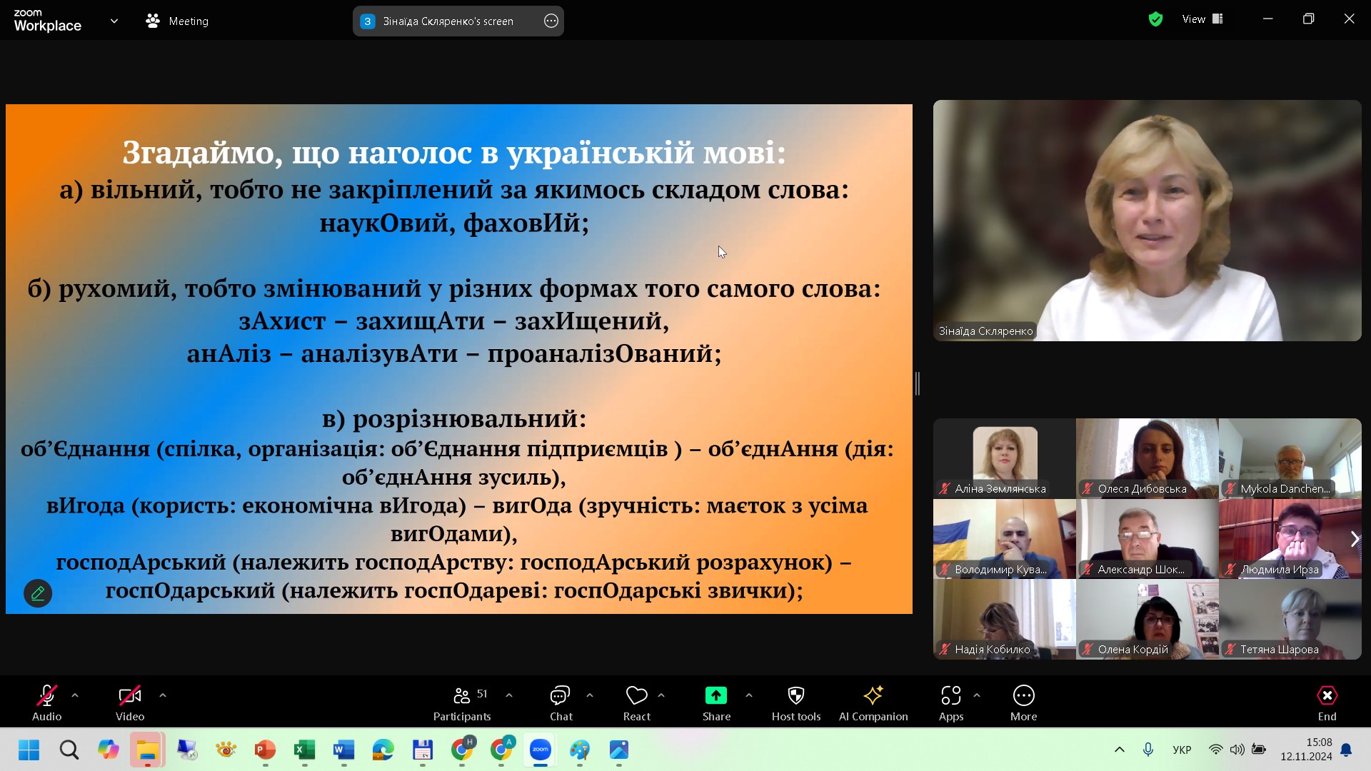 Доповідь Зінаїди Скляренко – учитель української мови та літератури, спеціаліста вищої категорії, учитель-методист Наукового ліцею комунального закладу вищої освіти «Хортицька національна навчально-реабілітаційна академія» Запорізької обласної ради – зосередилася на специфіці усного модусу української мови та особливостях його практичного застосування, зокрема наголосах в українській мові. Вона підкреслила важливість правильного наголошення, інтонації, що допомагають слухачам краще зрозуміти сказане. Лекторка детально пояснила, як правильно будувати речення та уникати типових помилок у побутовому та професійному мовленні.