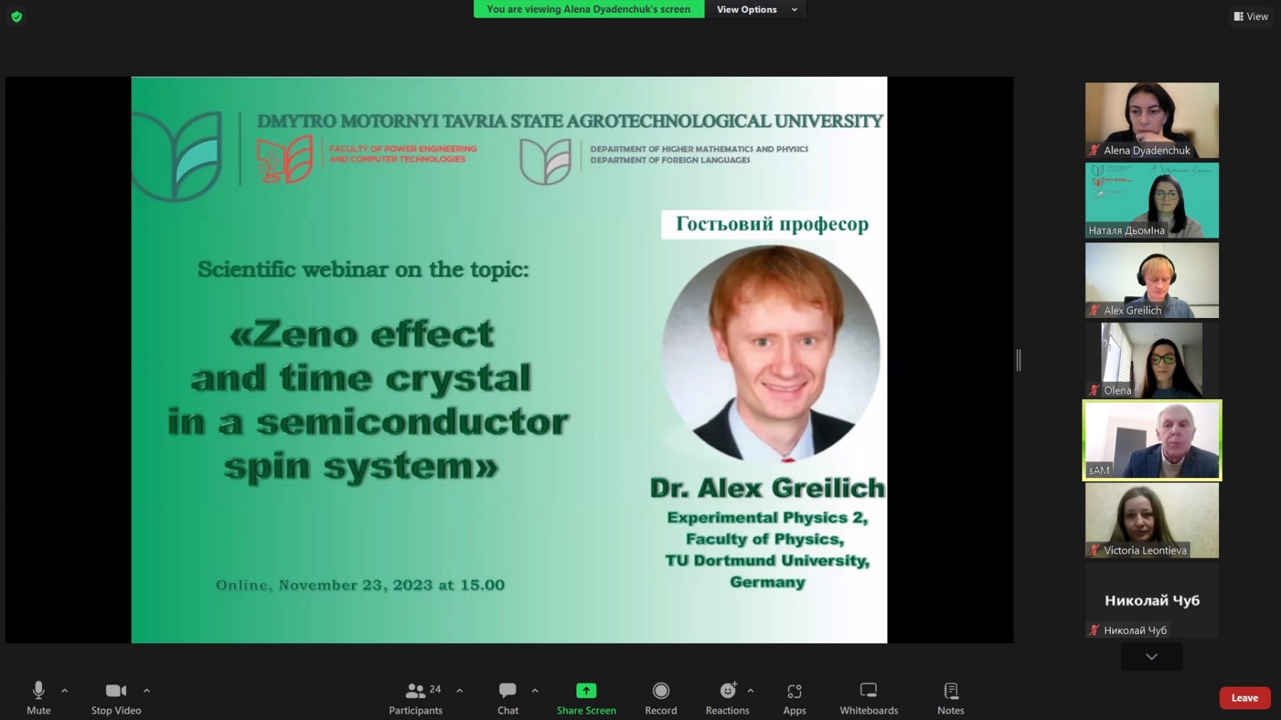 23 листопада 2023 року в Таврійському державному агротехнологічному університеті імені Дмитра Моторного відбувся науковий вебінар на тему «Zeno Effect and Time Crystal in a Semiconductor Spin System». Захід організовано у межах академічного руху «Гостьовий професор», спікером виступив Dr. Alex Greilich з факультету фізики Технічного університету Дортмунда в Німеччині.