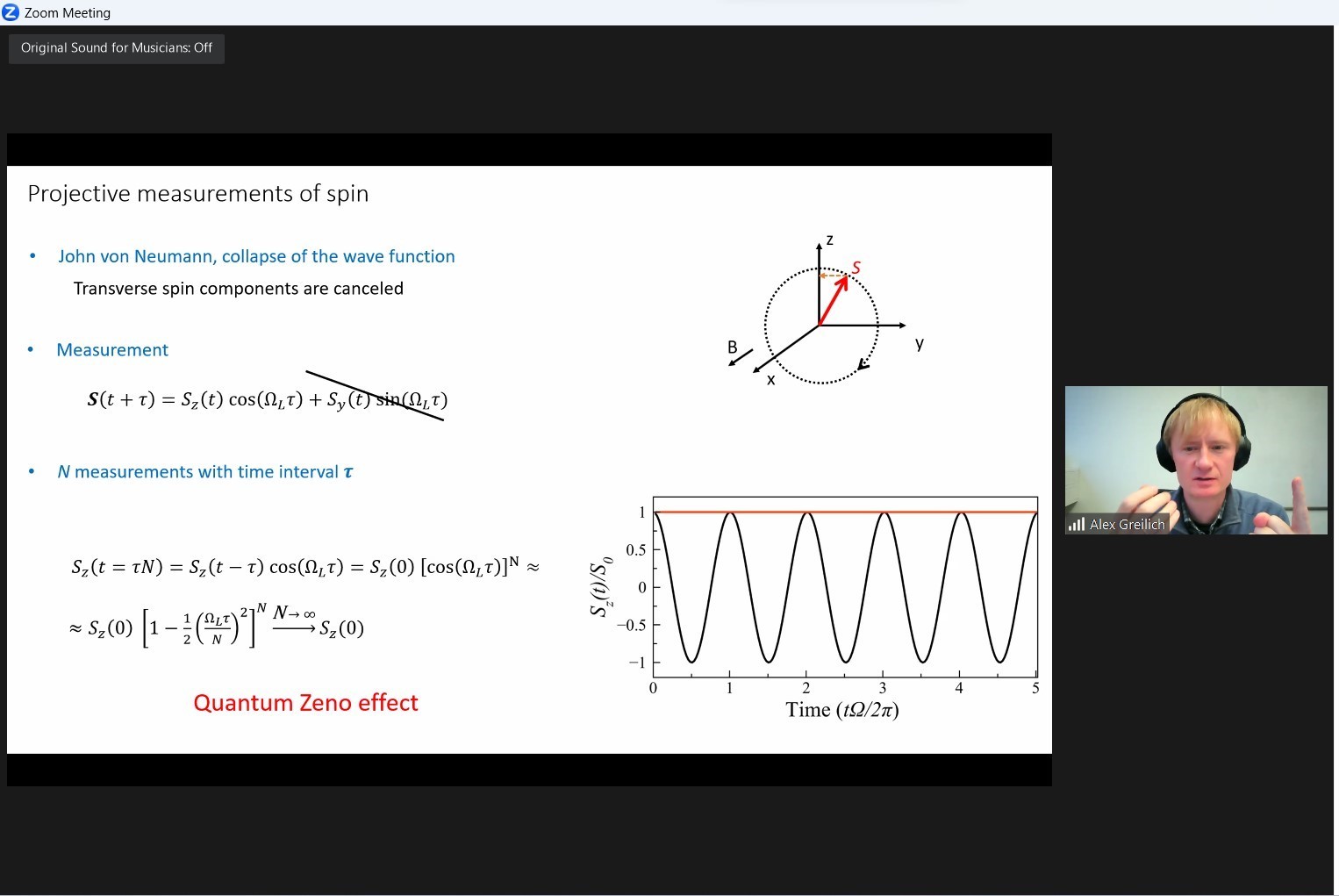 Науковий вебінар зібрав студентів, викладачів та науковців для спільного обговорення теми, пов’язаної із сучасними досягненнями у фізиці. Dr. Alex Greilich є керівником науковий групи у Дортмундському Техничному університеті, тематика якої зосереджена на когерентному оптичному контролі спінових станів у напівпровідникових наноструктурах, спіновій квантовій обробці інформації, яка може використовуватись у квантових комп’ютерах для обробки даних, використовуючи кубіт як фундаментальну одиницю. Він познайомив присутніх з основами теорій «Zeno Effect» та «Time Crystal» і поділився результатами своїх досліджень у напрямку контролю спінових станів у напівпровідникових наноструктурах, розкрив важливі аспекти та можливі перспективи використання цих явищ у розвитку квантових технологій та обчислювальних систем. Захід завершився дискусією, під час якої учасники вебінару мали можливість ставити питання та отримувати відповіді від доповідача.