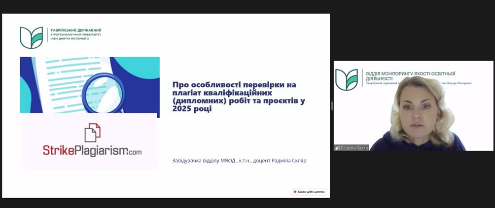 З першого питання виступила завідувачка відділу моніторингу якості освітньої діяльності Р.В. СКЛЯР, яка ознайомила із функціональними можливостями нової програми перевірки на плагіат кваліфікаційних (дипломних) робіт та проєктів, процедурою перевірки та рекомендованими показниками оригінальності робіт.