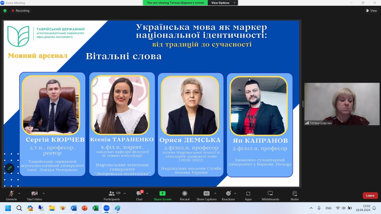 18 квітня 2024 р. у Таврійському державному агротехнологічному університеті імені Дмитра Моторного відбувся другий день мовного арсеналу «Українська мова як маркер національної ідентичності: від традицій до сучасності». Захід організований мовним омбудсменом університету Тетяною ШАРОВОЮ за підтримки ректора ТДАТУ Сергія КЮРЧЕВА та спрямований на популяризацію мовно-культурних знань серед викладачів та здобувачів освіти.