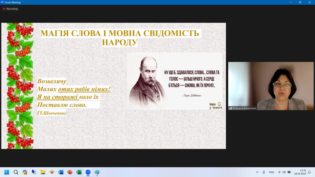 Спікеркою другого дня мовного арсеналу виступила Валентина БІЛЯЦЬКА – д.філол.н., професорка кафедри філології та мовної комунікації Національного технічного університету «Дніпровська політехніка» – із презентаційним виступом «Магія слова і мовна свідомість народу». На кращих зразках усної народної творчості та літературної класики доповідачка довела присутнім, наскільки значна роль історично відводилась слову, яке використовувалось і як оберіг, і як зброя проти недоброзичливців. Акцент було зроблено на традиціях роду і вимозі їх зберігати в сучасності, а також на використанні магічної сили слова, насамперед поетичного, для захисту захисників та захисниць України.