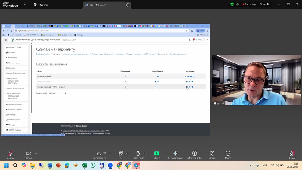 26 серпня 2025 р. члени Навчально-наукового центру, начальник Т.М. ШАРОВА та провідний фахівець А.В. ЗЕМЛЯНСЬКА у семінарі «Використання Moodle» для науково-педагогічних співробітників ТДАТУ, організованого Центром інформаційних технологій та систем.