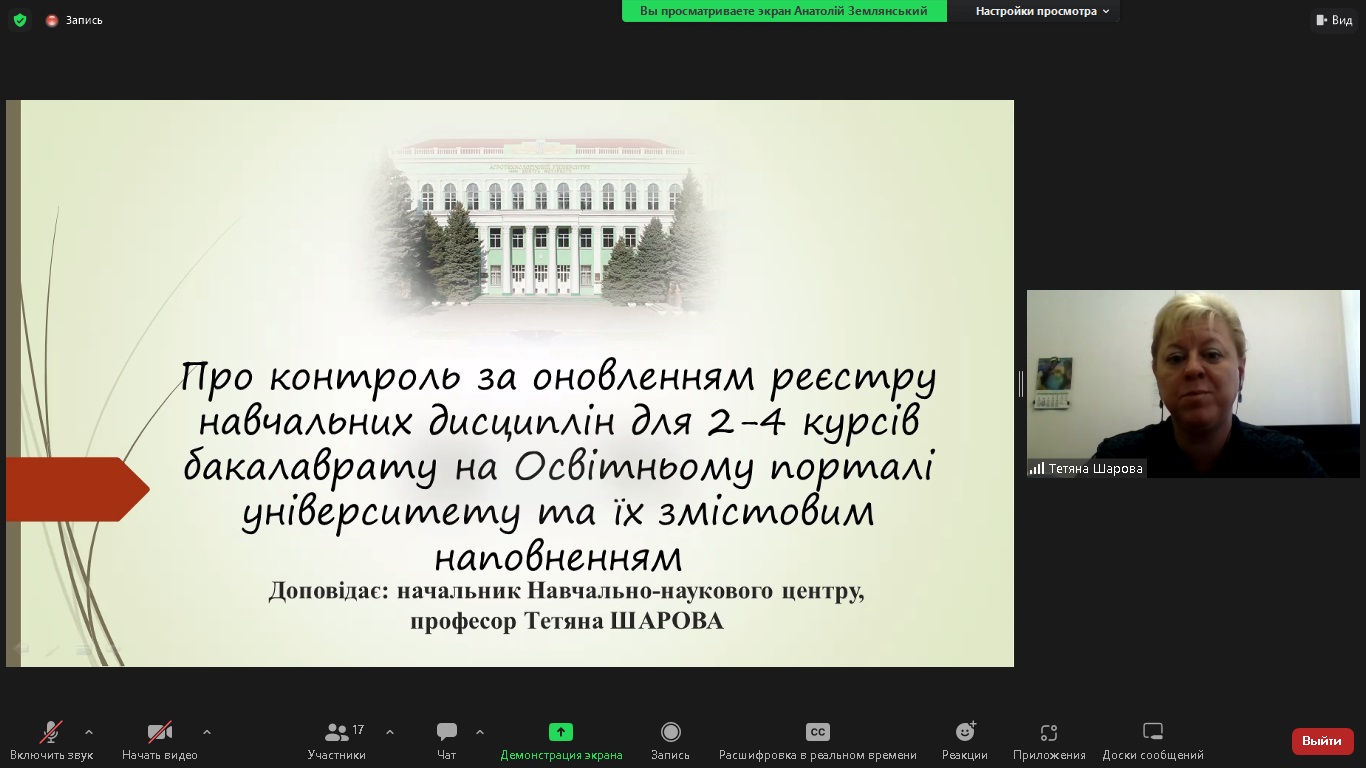 Про результати перевірки реєстру дисциплін для 2-4 курсу бакалаврату та їх змістового наповнення на Освітньому порталі університету доповідала начальник ННЦ Т.М. Шарова, яка наголосила на основних вимогах до електронних навчальних комплексів та вказала, на що звернути увагу при формуванні сторінки курсу для 1 курсу бакалаврату та магістратури.