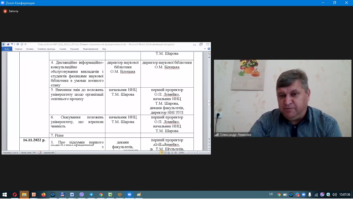 Засідання відкрив перший проректор О.П. ЛОМЕЙКО, який ознайомив присутніх із планом роботи Науково-методичної ради на І семестр 2022-22023 н.р. Він наголосив, що в плані беруться до уваги різні аспекти діяльності університету: методичної, наукової, ліцензування та акредитації освітніх програм, оновлення нормативної бази освітнього процесу тощо.