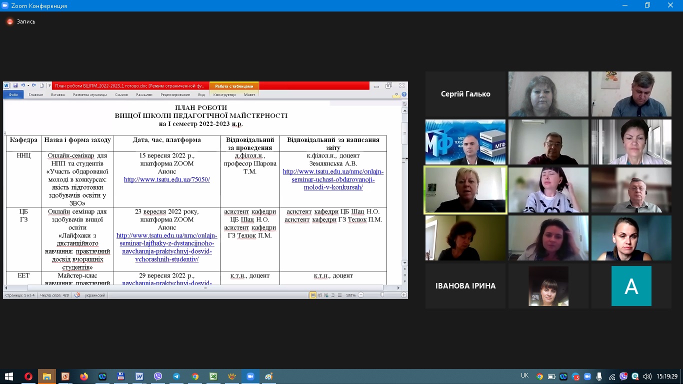 Начальник НЦЦ Т.М. Шарова презентувала план роботи Вищої школи педагогічної майстерності, функціонування якої в університеті значно розширює можливості науково-педагогічних працівників та здобувачів вищої освіти до саморозвитку та підвищення кваліфікації.