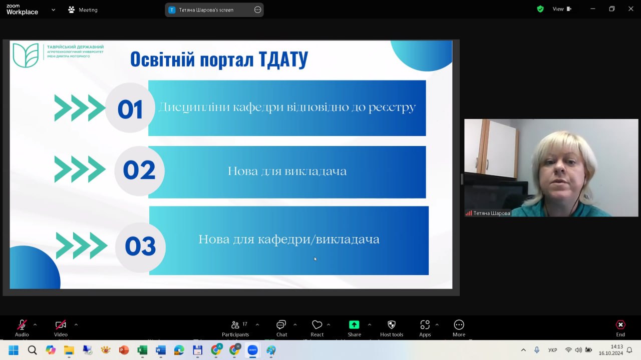 З першого питання виступила начальник ННЦ Т.М. ШАРОВА, яка ознайомила присутніх зі станом готовності електронних навчальних курсів на Освітньому порталі університету. Було підкреслено, що, незважаючи на значну кількість дисциплін, які викладаються в цьому навчальному році вперше, вони вчасно наповнюються необхідними матеріалами та різними формами контролю знань, умінь і навичок. Оскільки Освітній портал є головною освітньою платформою в ТДАТУ, науково-педагогічні працівники університету створили максимальні умови, в яких здобувачі можуть отримати якісну освіту незалежно від форми навчання (денної, індивідуальної, дуальної, гібридної тощо).