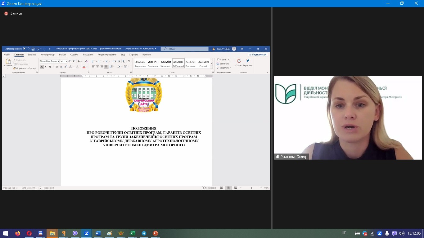 Завідувач відділу моніторингу якості освітньої діяльності Р.В. СКЛЯР ознайомила членів Науково-методичної ради з Положенням про робочі групи освітніх програм, гарантів освітніх програм та групи забезпечення освітніх програм у Таврійському державному агротехнологічному університеті імені Дмитра Моторного. Було підкреслено, що Положення розроблено відповідно до оновленої нормативної документації МОН України. Метою цього Положення є визначення статусу, функцій, прав та обов’язків робочих груп освітніх програм, гарантів освітніх програм та груп забезпечення освітніх програм у ТДАТУ.