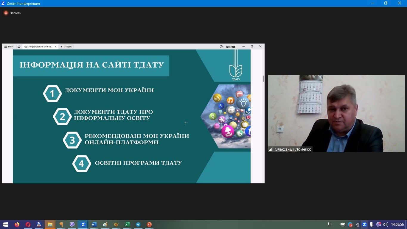 Перший проректор О.П. ЛОМЕЙКО виступив з питання імплементації в освітній процес університету неформального навчання здобувачів вищої освіти. Було означено зміни в цілях сучасного освітнього процесу та можливості, які відкриває неформальне навчання. Презентовано змістове наповнення відповідної рубрики на онлайн-сторінці ННЦ та основні онлайн-платформи, які пропонують масові онлайн-курси для отримання знань та набуття додаткових умінь і навичок. Наголошено на важливості імплементації таких онлайн-курсів у освітній процес ТДАТУ як частини освітніх компонент із перезарахуванням результатів опанування цих курсів, відповідно до Положення про порядок визнання результатів навчання здобувачів вищої освіти ТДАТУ, отриманих у неформальній та інформальній освіті.
