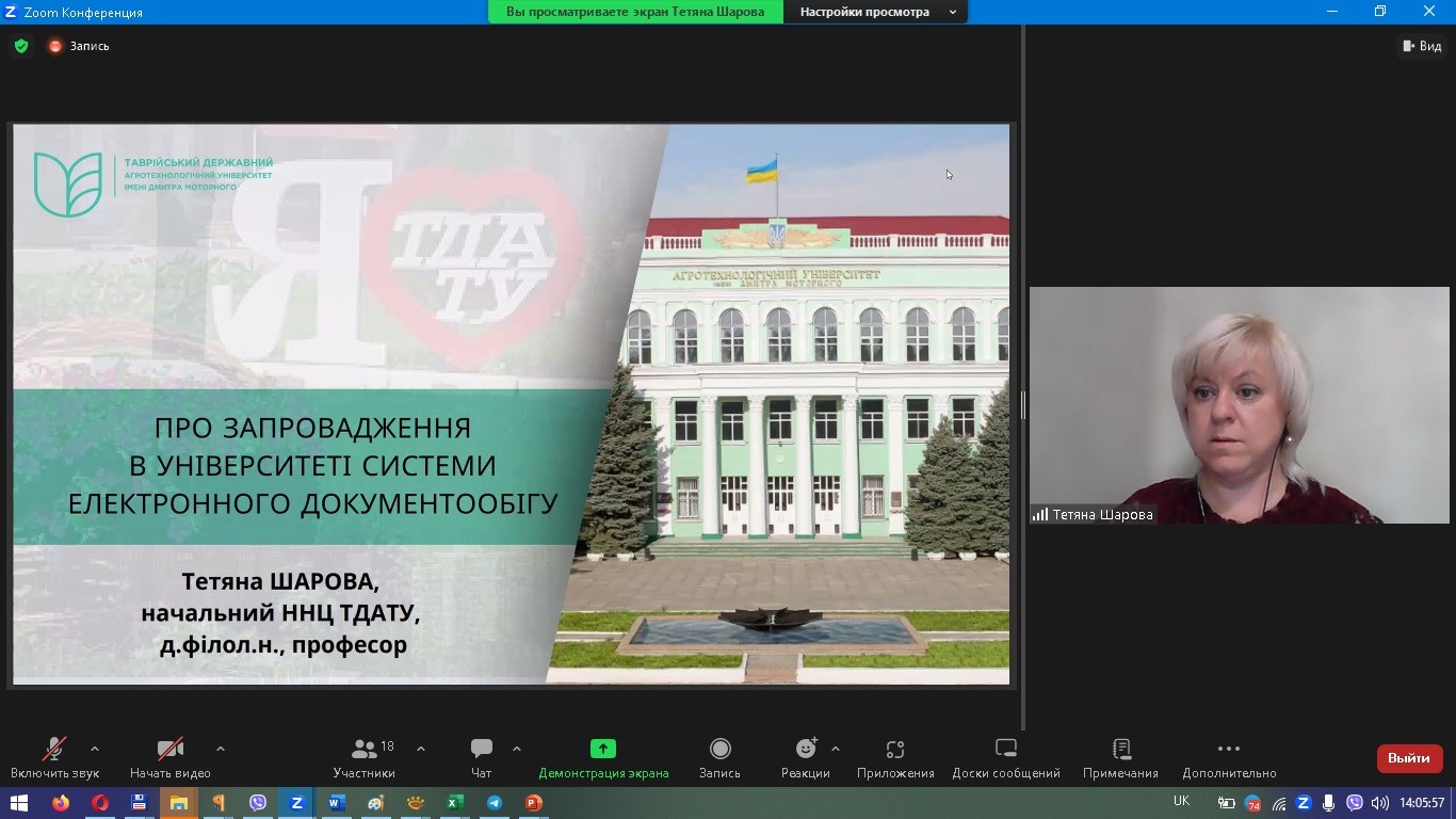З першого питання виступила начальник ННЦ Т.М. ШАРОВА, яка повідомила, що з січня 2024 р. запланований перехід ТДАТУ на систему електронного документообігу. Відзначено, що вже було проведено ряд заходів із ознайомлення адміністрації університету й керівників структурних підрозділів з питань користування системою та заплановано ряд заходів для співробітників та колективів коледжів ТДАТУ.