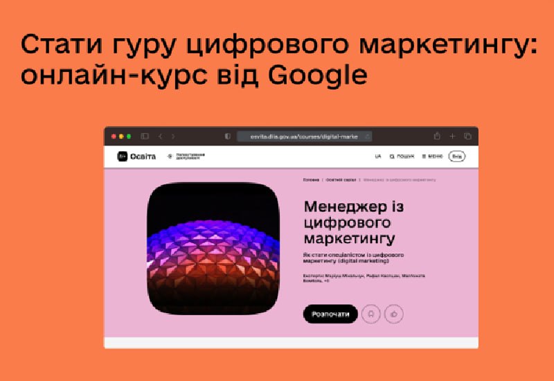 Автори курсу наголошують, що грамотний цифровий маркетинг може до 80% збільшити упізнаність бренду, тому він має високу затребуваність і надійні перспективи для розвитку. Під час навчання слухачі дізнаються, як зробити перші кроки до професії; що потрібно знати для опанування digital-маркетингу; отримають теоретичні знання та практичні навички; опанують такі інструменти цифрового маркетингу, як Google Ads, Google Analytics, Data Studio; матимуть можливість виконати ряд практичних вправ і використати спеціально підготовлені тести для перевірки набутих знань. Організатори: Міністерство цифрової трансформації України, Google.