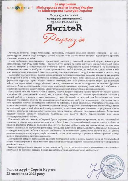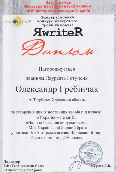 23 листопада 2022 року у м. Києві проходив Всеукраїнський дистанційний конкурс авторської прози та поезії «ЯwriteR», в якому взяв участь директор ВСП «Новокаховський фаховий коледж ТДАТУ» Олександр Гребінчак в жанровій номінації – авторська поезія (віршований твір) у віковій категорії віком від 24+ років.