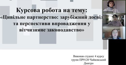 Студенти презентували та захистили свої роботи з різних актуальних тем цивільного та сімейного права. Акценти в дослідженнях були зроблені на умови воєнного стану. Відмічено, що курсові роботи підготовленні на належному рівні. Особливо варто відзначити роботи таких студентів: Вікторії Бобко, Катерини Овчар, Даніїла Великороднього та Юлії Мироненко