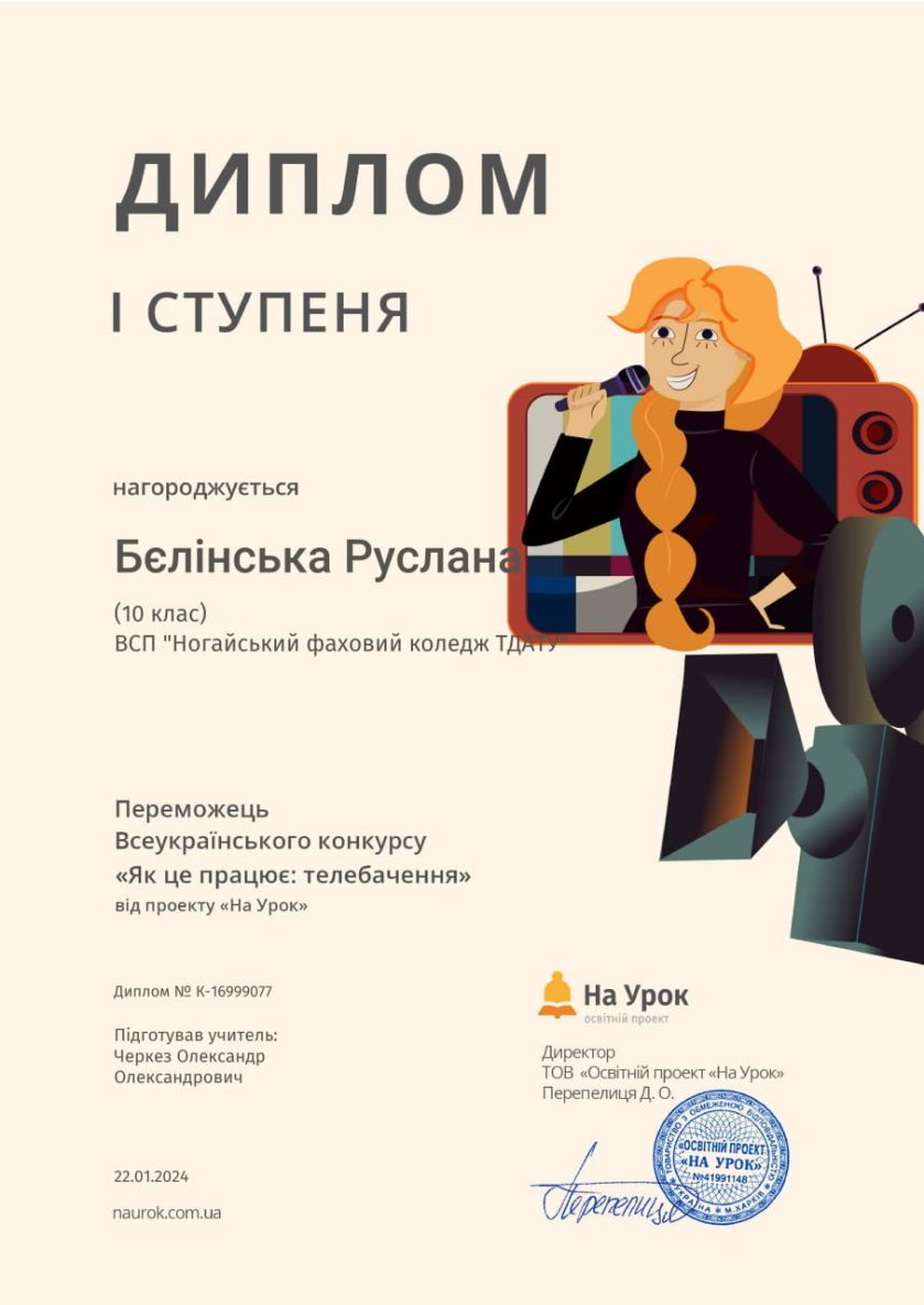 Студентка 10 групи ВСП “Ногайський фаховий коледж ТДАТУ” Руслана Бєлінська отримала перемогу у Всеукраїнському конкурсі з фізики від освітнього проєкту «На урок» «Як це працює: телебачення». Підготував студентку викладач фізики Олександр Черкез.
