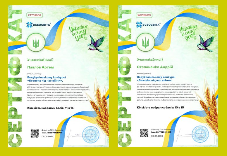 Також в.о.директора коледжу Олександр Герченов Олександр долучив студентів до конкурсу «Безпека під час війни» від ТОВ «Всеосвіта». Найкращі результати показали Артем Павлов та Андрій Степаненко . Організовані адміністрацією коледжу заходи дають можливість підготувати студентів до важливих випробувань сьогодення та перевірити рівень знань з безпеки життєдіяльності в реаліях воєнного часу.