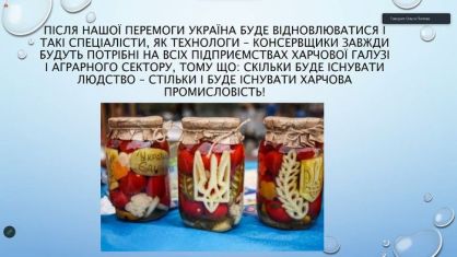 Після нашої Перемоги Україна буде відновлюватися і такі спеціалісти, як технологи – консервщики та технологи-винороби завжди будуть потрібні на всіх підприємствах харчової галузі і аграрного сектору, тому що: скільки буде існувати людство – стільки і буде існувати харчова промисловість!