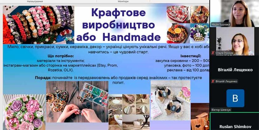 • Крафтове виробництво та хенд-мейд – виготовлення унікальних виробів ручної роботи. Під час обговорення студенти поділилися власними успіхами у цій сфері: хтось уже займається виготовленням меблів та виробів з дерева, інший створює популярні сьогодні їстівні букети. Це стало гарним прикладом того, як маленьке хобі може перерости у справжню підприємницьку діяльність.