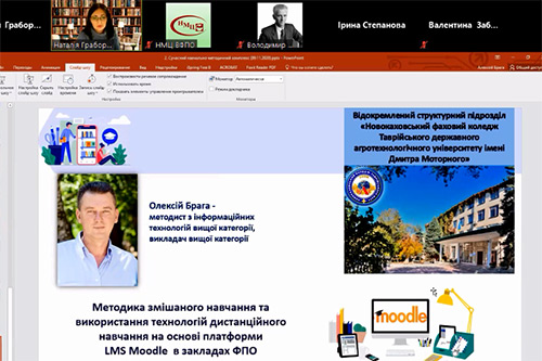 Методисти коледжу Наталія Граборенко та Олексій Брага виступили спікерами на курсах підвищення кваліфікації й поділилися досвідом впровадження інноваційної діяльності педагогів ВСП «Новокаховський фаховий коледж ТДАТУ». Наталія Граборенко презентувала питання інтеграції навчально-методичного комплексу дисципліни в інформаційно-освітнє середовище коледжу. Олексій Брага практично продемонстрував методику змішаного навчання та використання технологій дистанційного навчання на основі платформи LMS Moodle у коледжі.