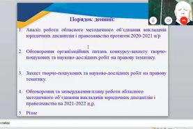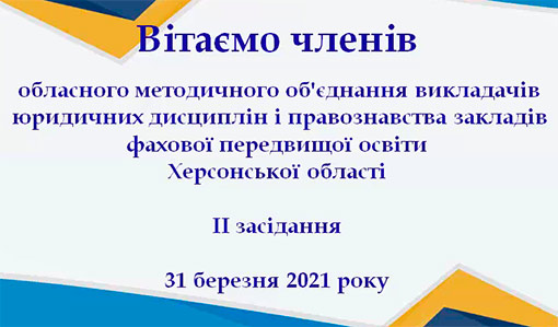 31 березня на базі ВСП «Новокаховський фаховий коледж ТДАТУ» відбулось чергове засідання обласного методичного об’єднання викладачів юридичних дисциплін і правознавства. Воно проходило у дистанційному форматі. У засіданні взяли участь 17 викладачів з десяти закладів фахової передвищої освіти Херсонської області.