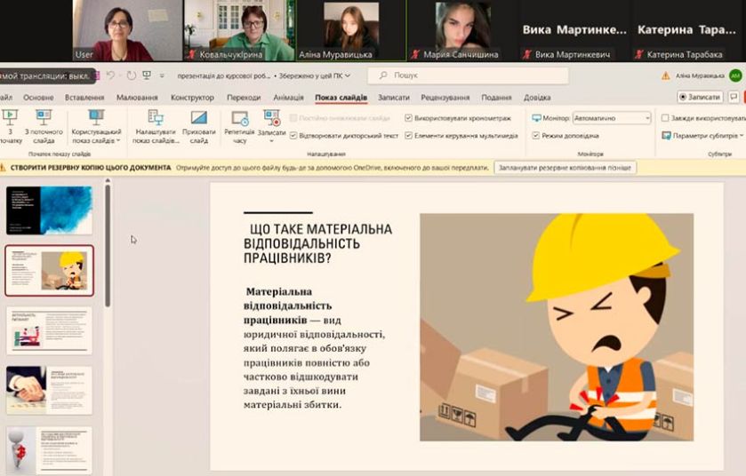 Комісія у складі викладачів юридичних дисциплін Олени Вітовщик, Ірини Ковальчук та Катерини Тарабаки оцінили роботи студентів і дійшли висновків, що розроблені тематики відповідають вимогам сьогодення. Здобувачі освіти висвітлили актуальні питання трудового права та охорони праці саме в контексті змін в законодавстві в період воєнного стану і впевнено продемонстрували свої роботи.