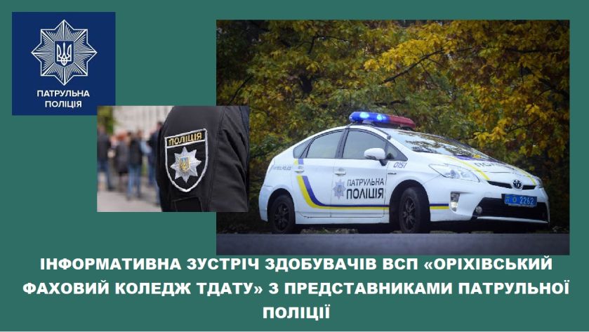 Днями відбулась інформаційна зустріч студентів-першокурсників (11оо та 11мк групи) ВСП «Оріхівський коледж ТДАТУ» із представниками патрульної поліції міста Запоріжжя старшим інспектором відділу зв’язків з громадськістю, капітаном поліції В. Коротенко та старшим лейтенантом поліції І. Божко.