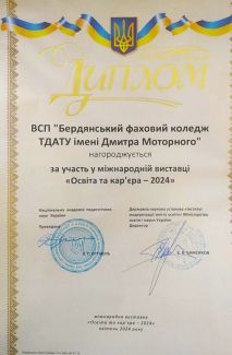 ВСП “Бердянський фаховий коледж ТДАТУ” взяв участь у Сороковій міжнародній спеціалізованій виставці «Освіта та кар’єра – 2024», яка проходила 26-27 квітня 2024 року в умовах дії воєнного стану віртуально, використовуючи новітні онлайн технології, на базі двох сайтів: