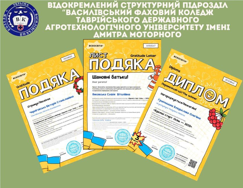 Здобувачки ВСП «Василівський фаховий коледж ТДАТУ» — Владислава Гринчишина (група Ф-21) та Софія Янковська (група В-21) — взяли активну участь у Всеукраїнській дистанційній олімпіаді «Вдалий старт. Осінь-2025», яка традиційно проходить на освітній платформі «Всеосвіта».