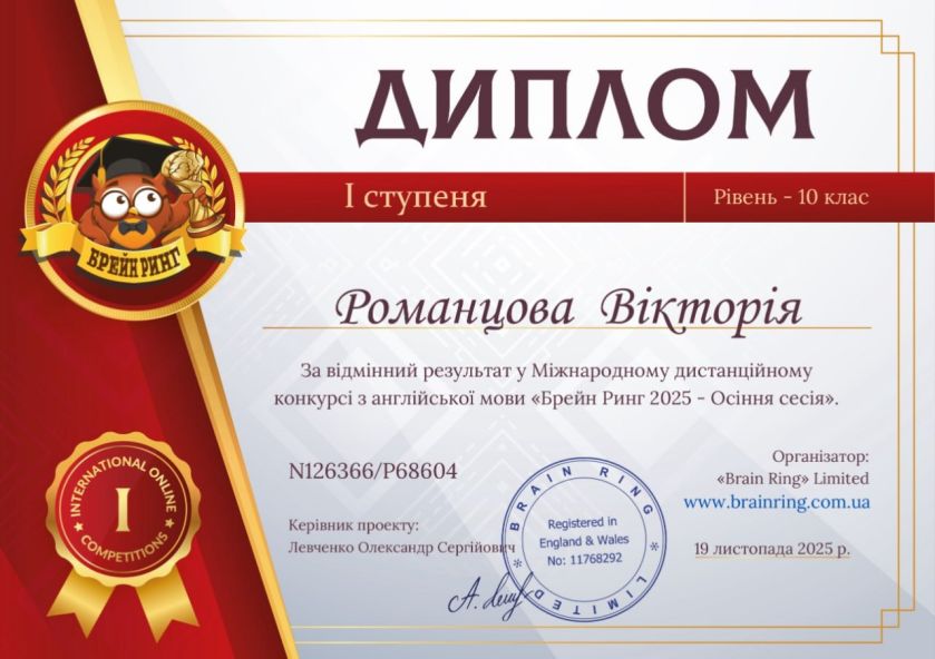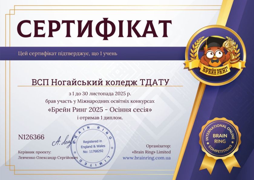 Викладач англійської мови Герман Дарина Дмитрівна організувала участь здобувачів освіти ВСП «Ногайський фаховий коледж ТДАТУ» у міжнародному конкурсі з англійської мови «Брейн Ринг 2025 — Осіння сесія». Студентка 10 групи Вікторія Романцова гідно представила заклад та здобула Диплом І ступеня, продемонструвавши високий рівень знань і наполегливість.