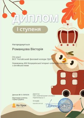 Вікторію Романцов, студентку 10 групи — 1 місце з англійської мови (викладач Герман Д.Д.);