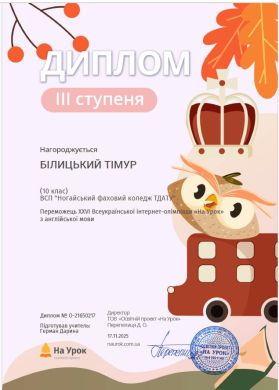 Тимура Білицького, студента 11 групи — 3 місце з англійської мови (викладач Герман Д.Д.);